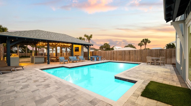 Setting the tone for a peaceful getaway, 2 identical guest bedrooms flank the first-floor entrance, both boasting 1 king bed, 2 lofted twin beds, and a private bathroom. A rec room—with a 70” TV, wet bar, Peloton, and foosball table—seamlessly connects to the expansive outdoor space. Enjoy sunny Florida days swimming in the private pool, relaxing on sun loungers, or honing skills on the backyard putting green. Under the shaded pavilion, dine on fresh fish from the natural gas grill, enjoy a mixed drink from the bar, and reconnect with loved ones next to the outdoor fireplace!