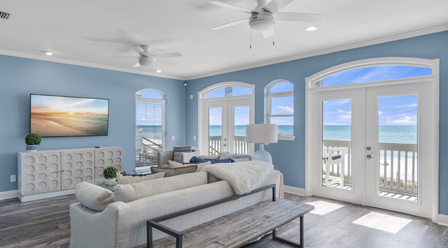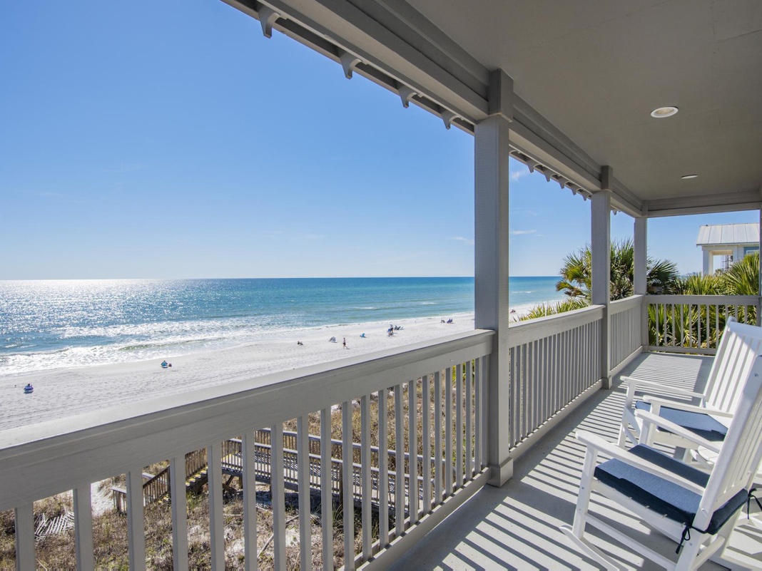 DETAILS: 143 Seaward Drive is a Gulf-front 5-bedroom, 4-bathroom home in a gated community that sleeps 17. Guests will enjoy watching dolphins from 2 spacious balconies in the morning and the convenience of an included 6-passenger golf cart.