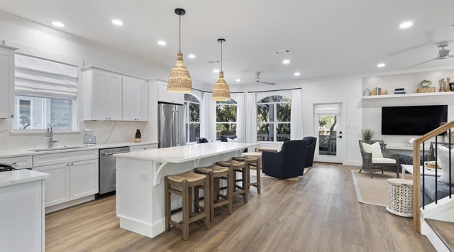 An open living, dining, and kitchen area with wide-plank wood floors and luxurious finishes welcomes guests to this 3-story home—a dining area off the entrance seats 8 opposite a bunk room with twin-over-twin beds. A wet bar with a wine chiller flanks a sparkling white kitchen with a marble backsplash and counters—a dine-in island seats 4. Decorated in shades of soothing white and dark navy, 2 sitting spaces provide areas to relax and reconnect. A wraparound sofa faces a 65” Smart TV, and 4 armchairs surround a rattan table. Dividing the 2 sitting areas is a door that opens to a covered deck! A gas grill and a table for 8 enjoy warm, salty beach breezes and offer views of the scrub oaks that fill the backyard. Steps from the deck lead down to an area with a picnic table and chairs and also connect to the beach tower above.
