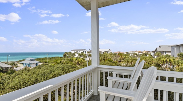 DETAILS: Beached Wales is a Gulf-view, 4-bedroom, 5-bathroom Blue Mountain Beach home with a Carriage House that sleeps 13—only 3 homes away from the beach! Enjoy a covered deck, Gulf views from a beach tower, and dappled shade in the backyard. Guests have access to a community pool, 3 private dune walkovers, and a dock on Draper Lake.