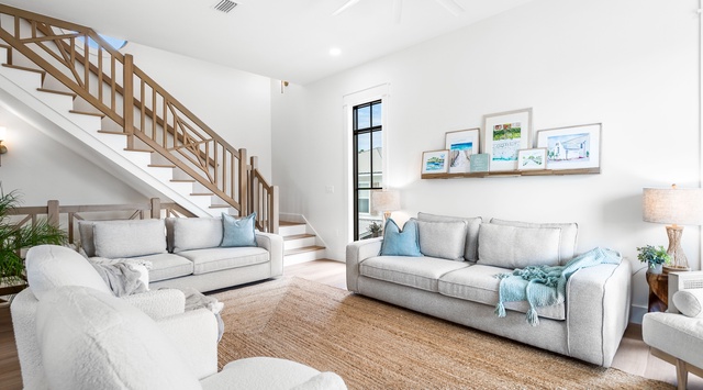 On the second floor are 2 guest bedrooms with queen beds and private bathrooms. An open living, kitchen, and dining area enjoy beautiful neighborhood views. A dining table seats 6 and is surrounded by large windows. The adjacent kitchen area has premium appliances, a dine-in island that seats 5, and a 6-burner gas range. A comfortable living area has 2 sofas and armchairs that surround a 75” Smart TV, and enjoy views from sliding glass doors that open to a balcony with 2 hanging wicker chairs.