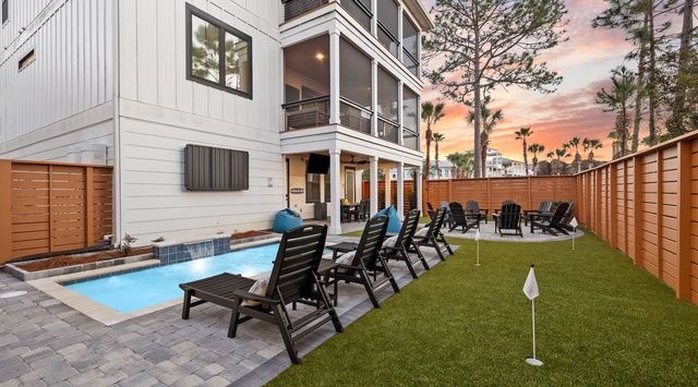 Sunlight fills the open-concept living, dining, and kitchen spaces found on the main level. A plush sectional, electric fireplace, 65” Smart TV, and Sonos sound system invite guests to enjoy a chill night of entertainment in the living space. The chef’s kitchen includes Z-line appliances and a 4-stool breakfast bar for brunches and pre-dinner cocktails. Choose the table for 10 inside or dine alfresco on the screened porch with a propane grill, 8-top table, patio chairs, and a TV. A second charming balcony is by the kitchen. At evening’s end, retire to the lovely primary bedroom with a king bed, Smart TV, private bathroom, and balcony access. Venture downstairs to find a shimmering private pool, 6-person patio table, and a firepit surrounded by seating in the enclosed backyard. The level hosts 2 beautiful guest bedrooms with Smart TVs and pool access. The first guest bedroom has a full-over-full bunk bed and a king bed, while the second has a queen bed.