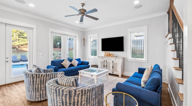 Two lavish king-bed guest rooms with private bathrooms welcome guests on the first floor. A spacious, open floor plan joins the living, dining, and kitchen areas. Home cooks and entertaining enthusiasts will love the gourmet kitchen, which is perfectly equipped with spacious countertops, tons of bright white cabinetry for storage, and premium stainless steel appliances. The nearby dining area offers seating for 8+ guests. Luxurious furnishings and a large flat-screen television make the living area a wonderful place to relax after a long day in the sun. French doors lead to the outdoor oasis, which offers a wonderful place to enjoy the coastal breeze with a morning coffee. A private, sparkling pool offers a great place to splash the day away (and can be heated seasonally for an extra fee). The pool deck and surrounding outdoor area create a wonderful place to relax and enjoy a grilled dinner around the patio table with seating for 8.