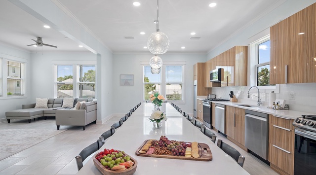 The main floor is the heart of the home—soft sunlight illuminates the spacious great room. A grandiose table seats 30 guests and turns any dinner party into an unforgettable celebration. The kitchen was designed for large parties, offering abundant cabinetry, counter space, and high-end appliances, including 2 refrigerators and 2 microwaves. The living area has 2 spacious sectionals and an impressive 86" TV, and the theater room's 75" TV and 7-person couch are great for casual lounging and movie nights.