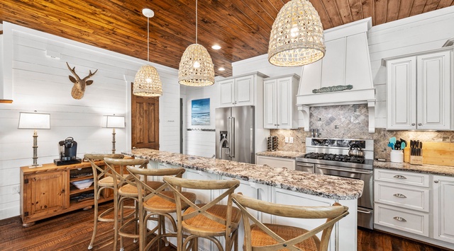 We absolutely loved the house and the location! Blue Mountain Beach is perfect for a family beach trip. The house exceeded our expectations with a wonderful open plan for living room, dining space for 13 (8 at the table & 5 at the bar), and well stocked kitchen. We loved the three king bedrooms and the kids loved the bunk room. It was fantastic for our family of 10 (3 adult couples and 4 kids). Oh, and the pool.... we spent many hours enjoying the pool, the outdoor space beside the pool, and back porch with a daybed swing. Other nice extras... this property includes use of a six-person golf cart and 4 adult bikes! Property is very close to public beach access plus another beach access at the end of Gulf Point Road. Be sure to checkout Blue Mountain Beach Creamery & Shake Shop for wonderful ice cream, donuts, and shakes! Also, you will find many excellent restaurants in the area.
