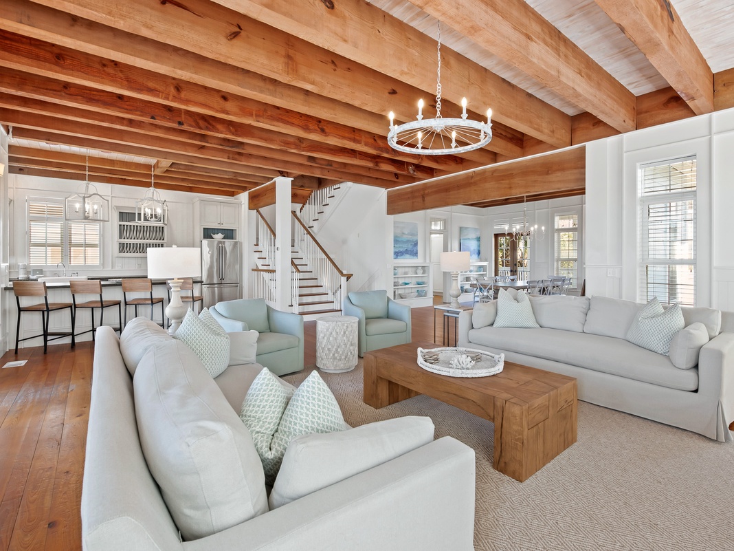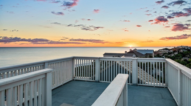 A wet bar tucked beneath the stairs makes it easy to prepare a cocktail before heading up to the roof deck to toast the sunset. The incredible 360-degree views stretch from Destin to Panama City Beach!