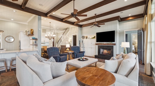 Step inside this stunning 2-level home to discover a first-floor great room designed for coastal relaxation. Dark wood beams and tile floors contrast against the pale green walls and tongue-and-groove ceiling, adding depth and warmth to the space. The kitchen is a chef’s delight with high-end appliances, a second refrigerator in the pantry, and ample counter space. Enjoy home-cooked meals at the 7-seat table, with extra seating at the 3-stool breakfast bar and the 4-person table in the living area. Guests can relax inside on the 2 sofas and 2 recliners flanking the 75” Smart TV or step out to the screened-in porch. Curl up on the cushioned patio seating or dine alfresco at the table for 8 while enjoying views of the Gulf. Off the porch is an outdoor shower, propane grill, and a boardwalk to the private dune lookout. For convenience, there is an office and laundry room on this level. When the day winds down, guests can retire to the guest bedroom featuring a king bed and private bathroom.
