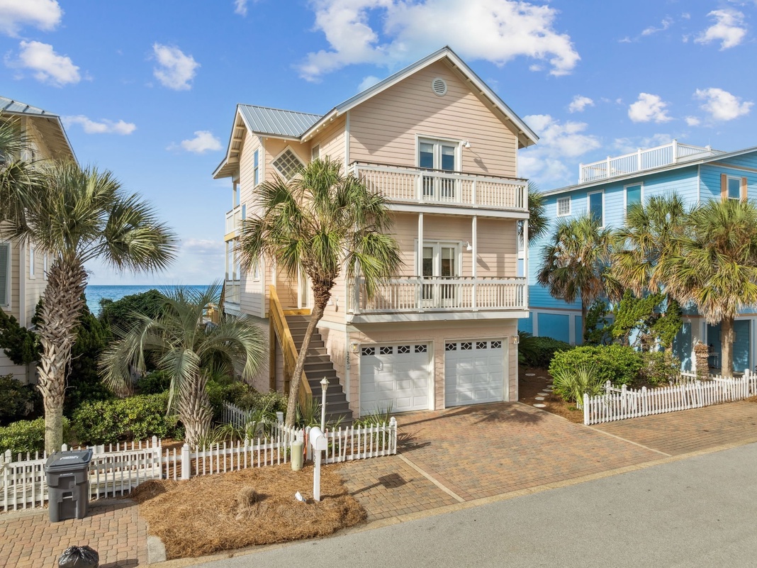 Framed by palm trees against a dreamy beach backdrop, this 3-level home is a picture-perfect 30A getaway. The first level features a shaded seating area and sitting space where guests can enjoy the peaceful atmosphere—the rolling dunes offer natural privacy. A few steps away is a grill for barbecuing burgers and hot dogs.
