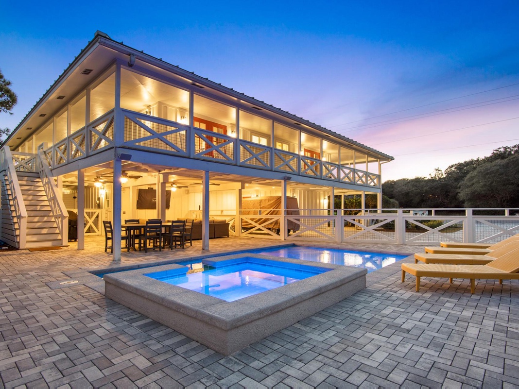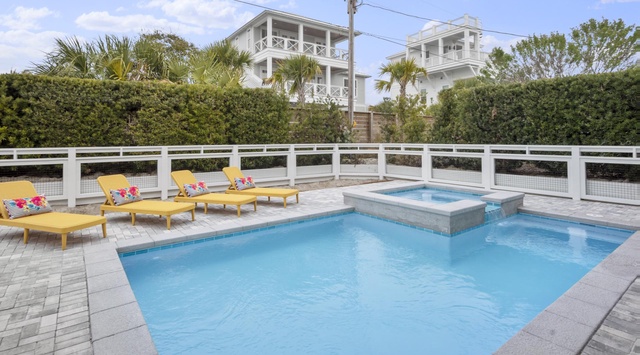 On the first floor, guests can relax in a second living room richly appointed with a velvet full sleeper sofa and dusty rose velvet chairs. A sophisticated bunk room has 2 twin-over-queen bunk beds, front yard views, and a private bathroom with a glass-enclosed shower. A guest bedroom has a king bed, rich blue accents, and a private bathroom with a glass-enclosed shower. Stepping outside, guests will find a large outdoor living room and pool deck where they can relax on a generous wrap-around sofa and watch TV, or enjoy freshly grilled fish at an outdoor dining table. Guests can recline on yellow lounge chairs when not enjoying the beautiful pool and sitting spa. An outdoor shower and parking for the golf cart are on the side of the home, while 2 colorful bed swings enjoy breezes at the front.