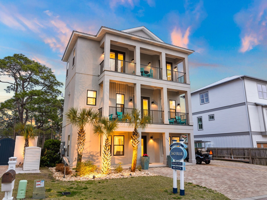 DETAILS: Everyone will be on Cloud Nine when staying in this 6-bedroom, 6.5-bathroom Dune Allen beach home that sleeps 17. Guests will love walking to the beach and will feel pampered by amenities, including a large private pool, gas fire pit, putting green, elevator, SONOS sound system, and 3 balconies.