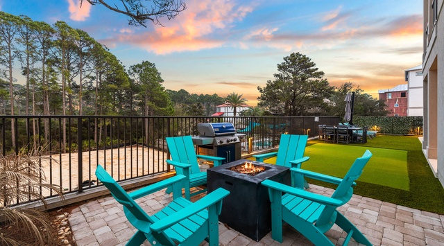 Cloud Nine’s decor is a luxurious fisherman’s delight. Shells, sealife sculpture, and a deer skull intertwine with natural finishes to create a comfortable, relaxing space suited to the home’s quiet wooded views. Guests staying on the first floor may select between 3 guest bedrooms. A guest bedroom has 2 queen beds, a flat-screen TV, and a private bathroom with a shower. A second guest bedroom has an upholstered king bed, flat-screen TV, and a private bathroom with a shower/tub combo. A third guest bedroom has a king bed, leather armchair, flat-screen TV, and a private bathroom with a shower. A door from the hallway opens to a covered porch and outdoor patio. A gas grill and shaded dining table make it easy to enjoy lunch while taking a break from swimming in the pool or relaxing in the sitting spa. A cornhole game and a gas firepit provide guests with spaces to chat and play long after the sun has set.