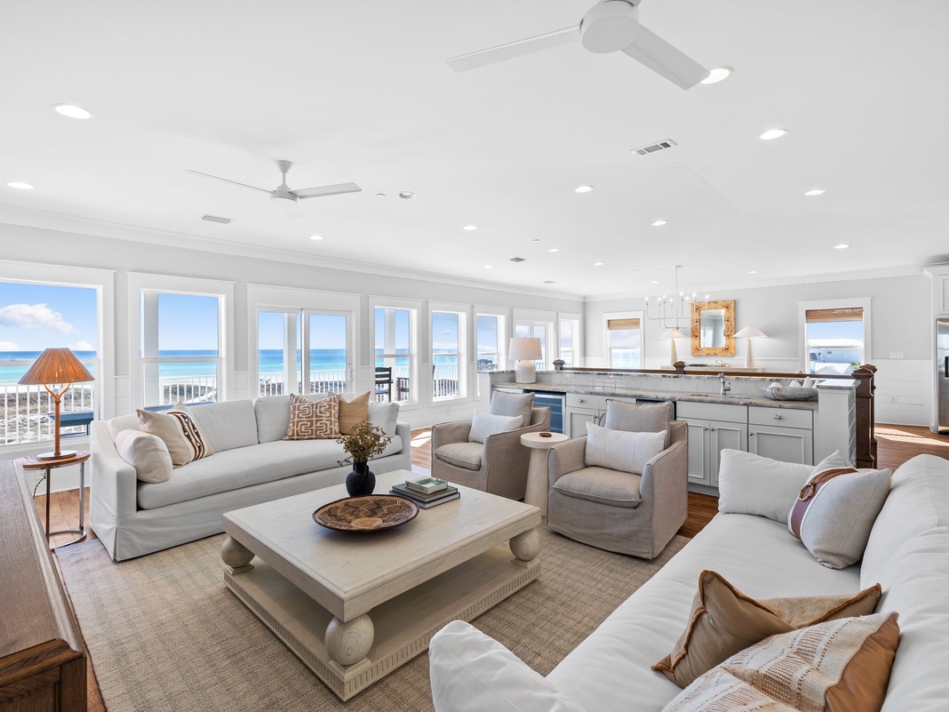 The main living level on the fourth floor ensures breathtaking Emerald Coast views throughout this spacious floor plan. Serene seafoam walls and natural wood floors accent the bright and airy feel. The chef's kitchen features bright white cabinetry, marble countertops, a premium gas range, top-of-the-line stainless steel appliances, and a large center island - a perfect spot for cocktails and appetizers while the cooks are at work. A large dining table and extra seats at the breakfast bar ensure plenty of room for everyone at mealtime. The relaxing living room boasts plush furnishings and a mounted flat-screen television. The first floor features a pool table and an additional living room with a full bath.
