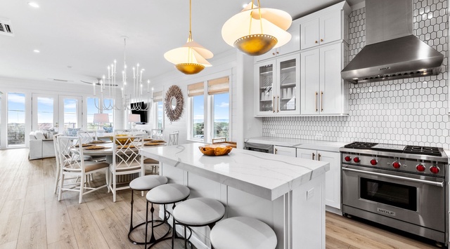 Ascend to the second floor, where the sunlit great room awaits. Dazzling blue Gulf views add a pop of color to the soothing palette of white shiplap walls and bleached hardwood floors. Chefs and guests who love to host will delight in the gorgeous kitchen, featuring high-end appliances—including a Wolf gas stove, SubZero wine cooler, and freestanding ice maker. After a day in the sun, cool off with a drink around the island/breakfast bar for 3 before digging into dinner at the table for 8. Along the back wall, the well-appointed living space with ample soft seating, a 75” Smart TV, and Sonos soundbar connects to a spacious balcony with a gas grill that overlooks the Gulf