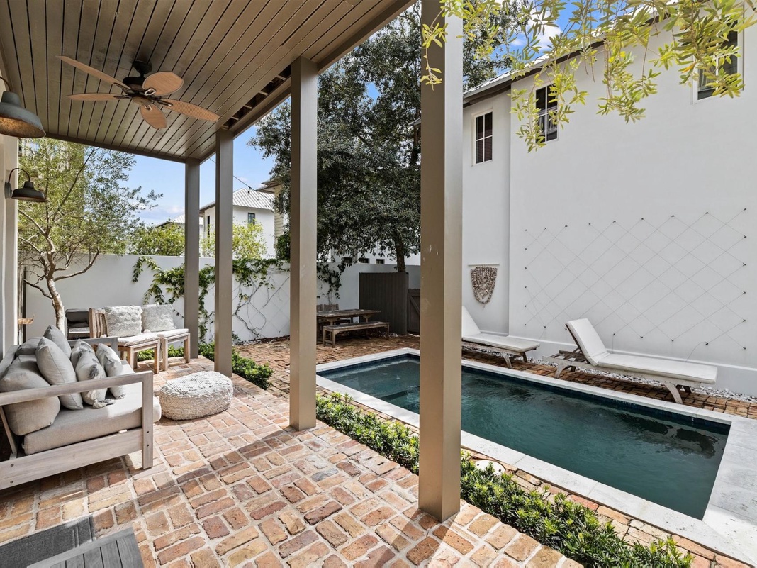 The outdoor oasis boasts a sparkling, private pool with a sunning bay surrounded by chaise lounge chairs and an outdoor dining set. There is plenty of seating for the entire party of 12. Take a 5-minute walk to the sugar-white sand beach and sparkling emerald waters just minutes by foot, or to the local shops and dining in the center of Rosemary Beach. 6 adult beach cruiser bikes provide a great way to see the sights in our wonderful 30A coastal towns. Barefoot Blue is the perfect place for your next coastal getaway. Book your stay now!