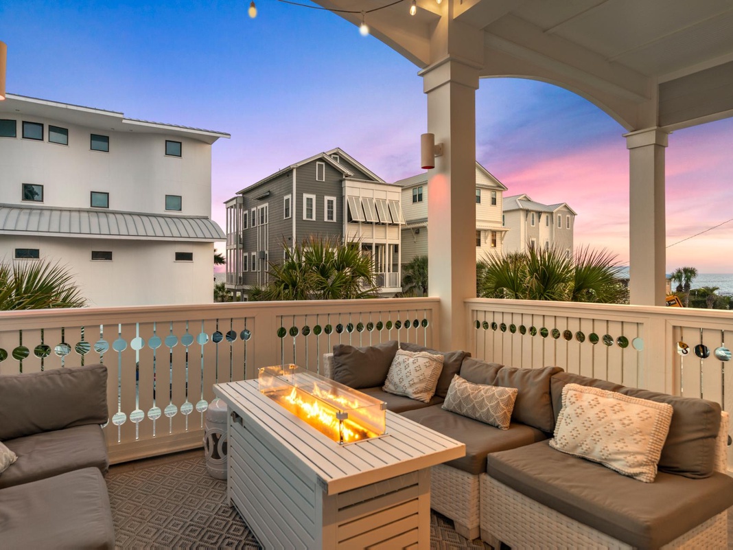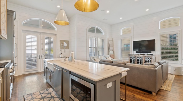 The main living areas on the second floor enjoy beautiful Gulf views. White shiplap and oyster shell chandeliers add a coastal feel to the large open kitchen, living, and dining area. Comfortable leather sofas and cozy armchairs invite conversation and are close enough to the generously sized marble-topped kitchen island that everyone can join in the fun. Next to the kitchen are French doors that open to a huge balcony. This outdoor living space is decked out with an outdoor grill and wet bar, a dining table, rocking Adirondack chairs, and an outdoor sofa. Guests will love the views of the Gulf while dining and relaxing in the shade.