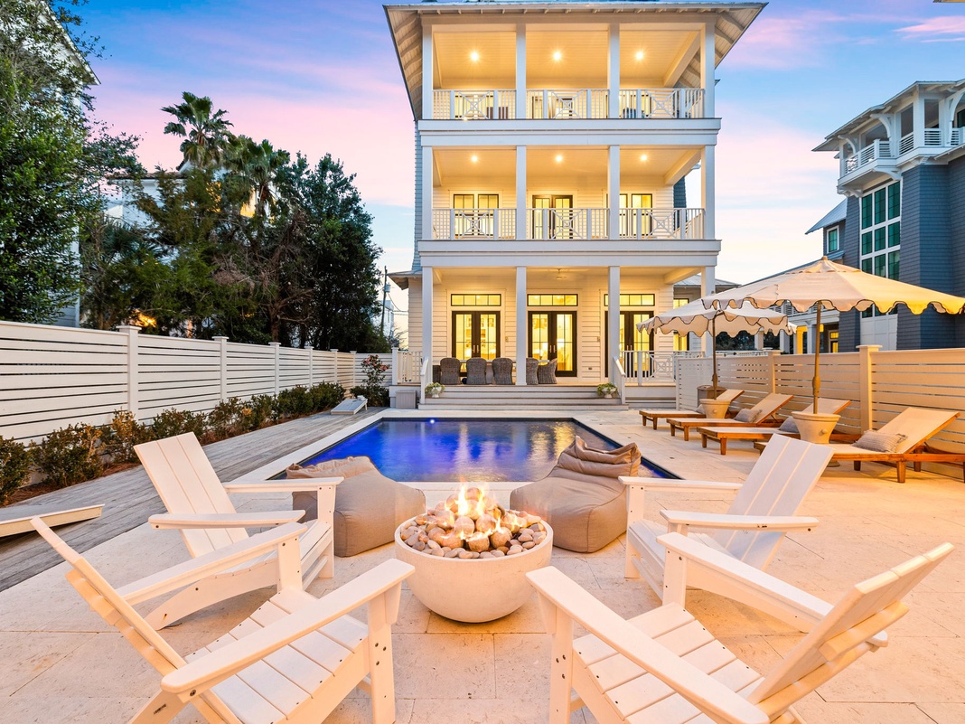 There is also a carriage house accompanying the home that has a king bedroom and 2 twins in the loft. It has its own living room and kitchenette with natural, wooden cabinetry and a flat-screen TV. Enjoy use of the lovely grilling area under the veranda that has beautiful patio furniture and an outdoor dining table. The large pool with the home comes with lounge seating and a fire pit to enjoy year-round. The home has 7 adult bikes that are meant for cruising around 30A or around the neighborhood! You can do it all here. Don't miss your chance to stay at "Sandy Lane" and book today!