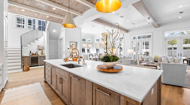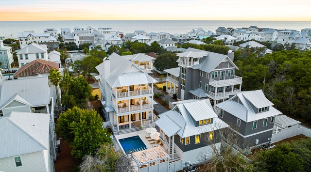 DETAILS: Enjoy enchanting Gulf views at "Sandy Lane" in Inlet Beach! This fabulous house is located on the cusp of Rosemary and Inlet Beach on the coveted Walton Rose Lane. With 7 bedrooms and 7.5 bathrooms, there are comfortable accommodations for up to 20 guests. The home's incredible amenities include a private pool, fire pit, carriage house, and multiple sprawling porches. It's professionally designed with functionality and luxury in mind, with notable features such as handcrafted Venetian plaster finishes and top-of-the-line appliances. The first floor's kitchen and living room have awe-inspiring details, from the backsplash to the fireplace to the light fixtures. There is combined seating for 15 guests to enjoy a meal together at the dining table and island. The first bedroom is down the hall with a king bed and private bathroom.