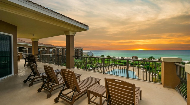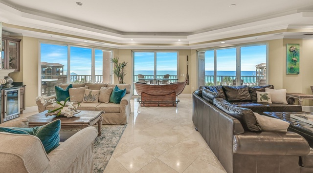 DETAILS: "Mediterranea Penthouse" is a breathtaking, newly remodeled luxury penthouse at Mediterranea of Destin. Boasting an impressive 3,300 square feet indoors and 1,700 square feet of patio space, there is a total of 5,000 square feet of luxurious indoor/outdoor accommodations! Occupying the entire fifth floor of the main building, this incredible penthouse offers unobstructed Gulf views from nearly every room! The open-concept Great Room features a wet bar with a wine fridge, a stand-alone boat bar, multiple seating areas, a 70-inch Smart TV, and a top-of-the-line entertainment system. An entertainer's delight, the gourmet kitchen is fully stocked and remodeled with high-end appliances. Enjoy dinner at the spacious 10-person dining table with the Gulf as a beautiful backdrop! Make your way to the Gulf-facing balcony for an unheard-of 1700 square feet of outdoor entertaining space, running the full length of the condo. Outfitted with dining tables and four chaise lounges, enjoy a meal al fresco or take in one of our famous Gulf Coast sunsets!