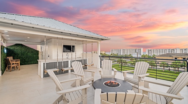 Completing the home is a rooftop lounge with a day bar, swing seating, fire-pit, and peek-a-boo views of the Gulf.