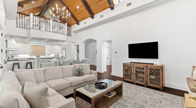 Guests will love the expansive second-floor porch, perfect for early morning coffees and beautiful sunset views. Right inside, guests will find an open kitchen, dining, and living room perfect for gathering the family together. The gourmet kitchen is equipped with stainless steel appliances and beautiful slate countertops. The third floor hosts a third Primary bedroom complete with a private bathroom walk-in closet and an additional loft area with 3 twin beds for sleeping.