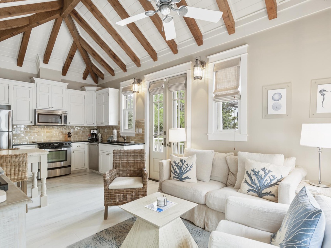 DETAILS: Memories on Water Carriage House is an adorable mini version of Memories on Water Main House. Guests will love the lush landscaping at the entrance, the dramatic exposed ceiling beams in the living area, and the tasteful interior coastal accents. Guests have everything they need in the full kitchen and will enjoy welcoming the day from a private balcony. A guest bedroom has a king bed and a private bathroom with a shower/tub combo.