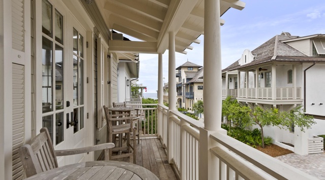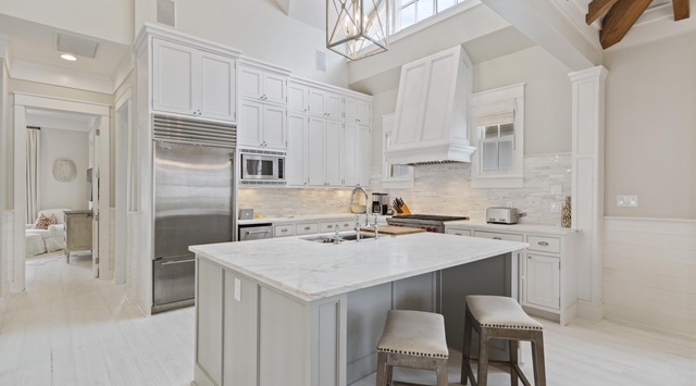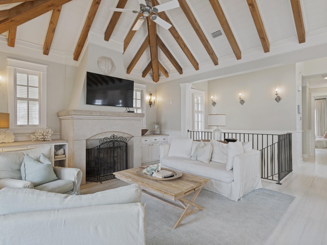 Dramatic exposed ceiling beams on the second floor pull the eye up to the beautiful arched ceilings. An open kitchen, dining, and living space enjoy lots of natural light and open to a balcony with views of Rosemary Beach. A sofa and comfy armchairs surround a dramatic fireplace in a living area dotted with seashells and coastal accents. Premium appliances, marble countertops, and a center island that seats 4 complete a beautiful chef’s kitchen. A dining table seats 8. Tucked behind the kitchen is a guest bedroom with a king bed and a private bathroom with a shower/tub combo. A smaller den gives guests a private area to relax on a wrap-around sofa, play games, or enjoy a movie.