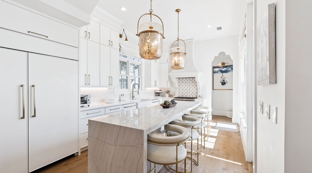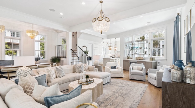Designed by renowned architect Julia Starr Sanford in the Dutch West Indies style, The Ville evokes a breezy tropical retreat with its stunning front porch overlooking 30A and lush greenery—ideal for savoring morning coffee or even a nightcap! The first floor welcomes guests into a sumptuous great room, adorned with hardwood floors and ornate light fixtures. In the living space, sink into the soft sofas and armchairs for a night of TV or catching up over cocktails—easily mixed at the adjacent wet bar. The dining space pairs elegance with comfort, featuring 4 chairs, a beautiful wooden table, and a comfy banquette bench beneath 2 dazzling chandeliers and multiple windows. In the sun-dappled kitchen, find a gorgeous waterfall island with a breakfast bar for 4 and top-of-the-line appliances. The secluded courtyard pool is perfect for chasing away the heat. Take advantage of the grill and built-in sink with an evening barbecue shared at the outdoor table for 8 under the open sky and twinkling string lights. Then, wind down the evening with a nightcap on the cushioned patio seating.