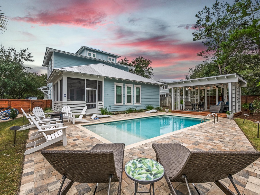 - Private pool with screened-in patio, grilling area, and outdoor dining