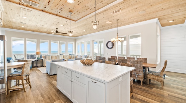 The first floor houses a game room complete with TVs, arcade games, and more. Off the game room are the first floor bedrooms. Make your way upstairs to the second floor for the luxurious open-concept living and dining area, including the fully-stocked, top-of-the-line kitchen. The third floor boasts an impressive 3 king primary suites and stunning views from Panama City all the way to Destin!