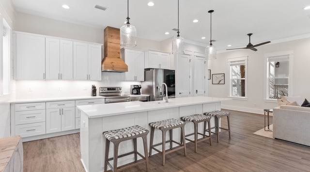 Step inside this bright and spacious home to find a sunlit great room featuring minimalist décor and a shiplap accent wall. An oversized sectional and armchair in the living space encourages family nights around the TV after a day of sun and surf. The fully equipped kitchen has LG appliances and a large center island that seats 4—enjoy a quick breakfast or a glass of wine as dinner simmers! For formal meals, gather at the 8-person dining table or dine alfresco at the table for 6 on the covered porch. Head down to the pool deck, where 3 lounge chairs beckon for long days of sunning while surrounded by swaying palm trees. A guest bedroom with a king bed completes this floor. Each bedroom in this home features its own private bathroom. A delightful primary bedroom waits on the second level with a king bed and a sunny furnished balcony overlooking the pool. Additionally, this floor includes 2 guest bedrooms with a king bed in the first and 2 twin-over-twin bunk beds, plus a lofted twin in the second.