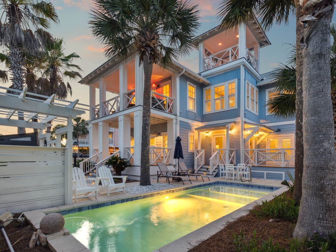 DETAILS: "23 Palms" is Seagrove's quintessential beloved beach house just steps from the sand! This 4-bedroom, 3.5-bathroom home sleeps 14 guests comfortably, making it perfect for multi-generational families or group trips. There are several fantastic amenities, including a private saltwater pool, Gulf and lake views, and multiple porches to relax on.