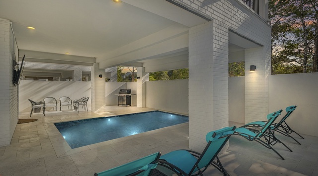 This soaring 3-story retreat is great for spending quality time together. On the ground-floor patio, soak up the sun on loungers, swim in the covered pool, and dine alfresco with the BBQ grill—there's even a 65" TV for entertainment. After the beach, the outdoor shower is great for rinsing off before accessing the elevator.