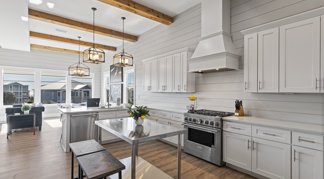 Designed with a sophisticated beach aesthetic, this home's second floor showcases breathtaking views through expansive windows. A welcoming great room blends the living, dining, and kitchen areas for seamless conversation. A posh living area offers luxe yet laid-back furniture to socialize and enjoy a movie, especially with a 60" TV. Surrounding this inviting spot are classic shiplap walls and gorgeous artwork, while overhead, natural wood beams accent the high ceilings. The formal dining space seats 10, while the breakfast bar seats 4 more. Prep Sunday brunch or gather snacks for the beach in this chef-worthy kitchen, with pristine white cabinetry and high-end appliances. Access the wraparound terrace off the great room to enjoy gentle sea breezes and stunning sunsets. The guest bedroom with a king bed and private bathroom offers a convenient place to retire.