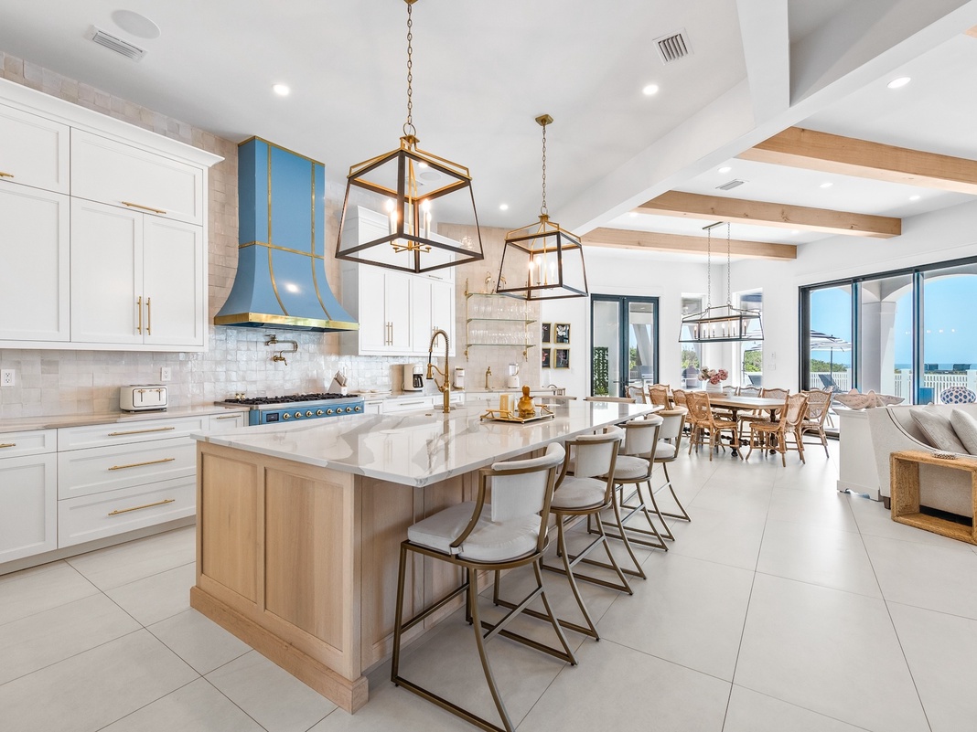 The gourmet kitchen is located on the first floor and features Viking appliances, designer cabinets, and beautiful custom countertops. The wine chiller is always nearby. The island counter offers abundant counter seating and opens onto the dining area. Adjacent is the living room with its sweeping views of the Gulf and cozy seating before an expansive TV. Simply put, it’s the perfect venue for vacation movie night. Just steps away is the spectacular outdoor living space with a covered patio, private pool, sitting spa, and outdoor kitchen with a grill. Lounge poolside with a cocktail or stroll down to the turquoise waters of the Gulf. It’s all right there.