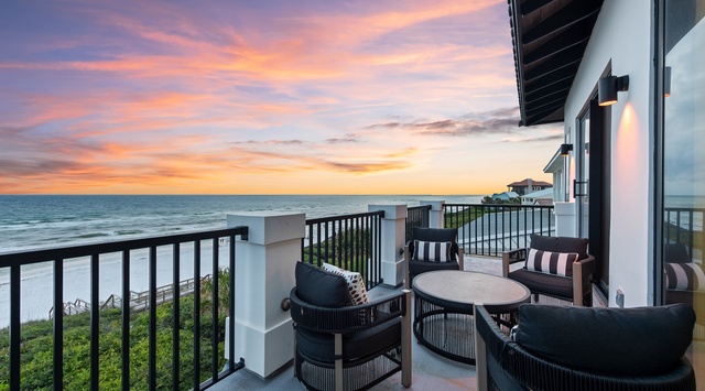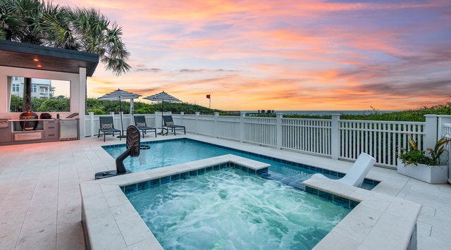 DETAILS: Some homes simply define coastal luxury, offering a spectacular Gulf-front location, exquisite Mediterranean design, and everyone’s favorite amenities. So it is with 45 Sea Walk Circle in the heart of Seagrove Beach. This newly constructed 8-bedroom, 5.5-bath Gulf-front getaway features a private pool and sitting spa—as well as a private beach walkover that leads to more than 50 feet of private waterfront. All of the excitement of Seaside is just a short drive away. This 3-story, 4,395-square-foot luxury vacation home sleeps up to 25 guests.