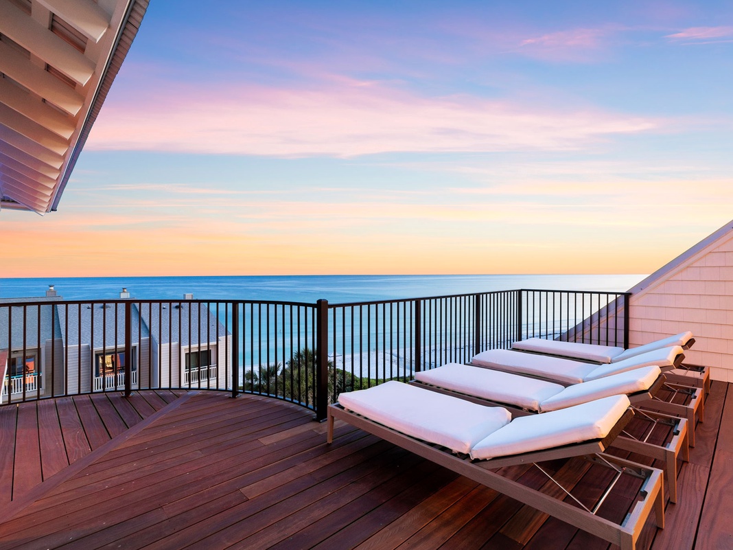 The rooftop deck beckons guests to unwind on opulent outdoor furniture, sip cocktails at the wet bar, sunbathe on loungers, and unwind in front of the outdoor TV—an entertainer’s delight!