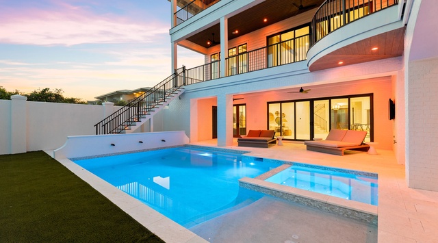 An inviting entryway opens to the first-floor living area of this 4-story retreat, with plush furniture, a 65” TV, and wet bar. Accommodations include a bunk room with 2 queen-over-queen beds and private bathroom, 2 guest bedrooms with king beds, one boasting deck access and a private bathroom. A Peloton in the laundry room with 2 washer and dryers provides convenience. An expansive, partially-covered patio boasts a private pool and sitting spa and outdoor kitchen.