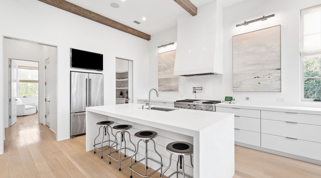White-oak wood floors and soaring ceilings greet guests as they enter this custom-built, 3-story home. Use the stairs to reach the open-concept living space on the second level—an abundance of natural light filters through the wall of windows, highlighting the 12’ beamed ceiling. Seamlessly move between the open living area chef’s kitchen—featuring quartz countertops, high-end appliances, and a wet-bar. The round dining table seats 4, with 4 additional seats at the breakfast bar. A couch and divan offer comfortable seating in front of the 75” Smart TV. When evening falls, a primary bedroom on this floor has a king bed and a private bathroom.