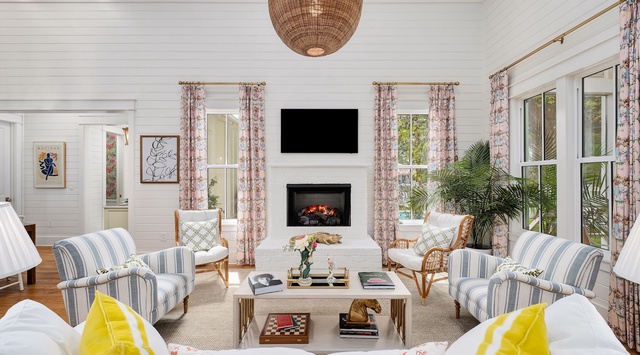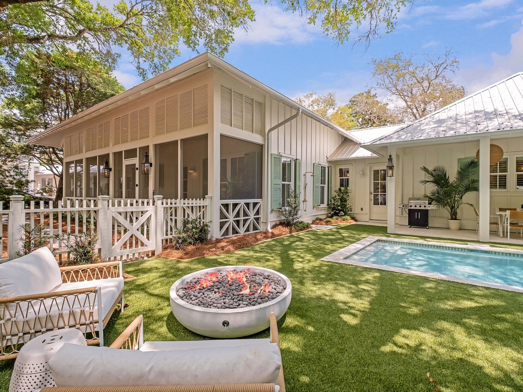 Splashes of color, patterns, and natural materials combine to create a gorgeous coastal retreat throughout this delightful property. The fun begins in the screened front porch featuring cushioned patio chairs, a porch swing, and 2-person dinette set. Inside, hardwood floors and shiplap walls span the inviting first-floor great room. In the living area, 4 armchairs and a soft, white couch offer seating around the Smart TV and fireplace. Culinary creation is a delight in the stunning kitchen, equipped with top-of-the-line appliances and Spring-green cabinetry. Adjacent is a 6-person table, with additional seating available at the 3-stool bar. Head outside to the dreamy yard, boasting a crystal-clear private pool and 2 pastel-hued sun loungers, shaded by a pink resort-style umbrella. Enjoy peaceful afternoons drinking lemonade on the covered patio, outfitted with a 6-person alfresco table and grill. At nightfall, cozy up by the stylish firepit for s’mores and stories. An outdoor shower and laundry closet make post-beach clean-up a breeze. For bedtime, there are 2 colorful bedrooms on this level—1 guest bedroom with a queen bed and 1 primary bedroom with a king bed.