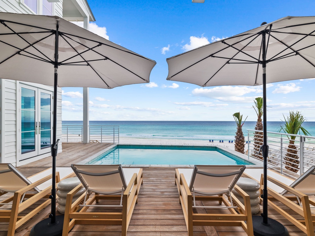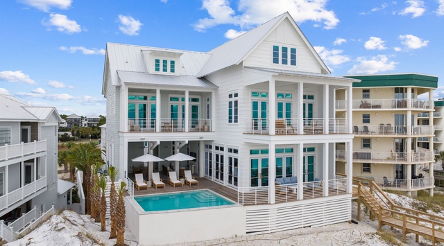 DETAILS: A testament to seaside splendor, Southern Chateau sits along the Emerald Coast, steps from the Gulf’s sugar-soft sand and turquoise water. The lavish Main House and Carriage House boast 8 bedrooms, 8 full bathrooms, and 3 half bathrooms, providing an unparalleled indoor and outdoor living experience for 22 guests in illustrious Seagrove Beach. Wake to dramatic views of the shimmering Gulf, lounge on the private beach frontage, or cool off in the saltwater pool of this Florida retreat, where every day is an expression of beachside decadence.