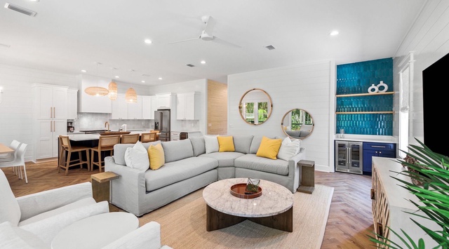 This stunning 2-story home welcomes guests through a vibrant yellow door that opens to the first-floor great room, boasting shiplap walls, hardwood floors, and gorgeous natural lighting. The pristine white kitchen has high-end Thor appliances, spacious countertops, and a large kitchen island that functions as a 5-stool breakfast bar. An adjacent dining area offers ample seating for 8—perfect for hosting an intimate gathering. The living area is designed for relaxation, featuring a plush oversized sectional, matching armchairs, and a 75” TV. A Thor beverage cooler can be found in the corner with a sparkling blue backsplash that adds a pop of color. The back deck has 4 rocking chairs overlooking the private pool with a soothing waterfall and 2 in-pool loungers. The patio boasts a 6-seat alfresco dining table and a convenient propane grill, allowing for seamless outdoor dining experiences. There are 2 comfortable guest bedrooms on this floor, both with king-sized beds and 50” TVs.