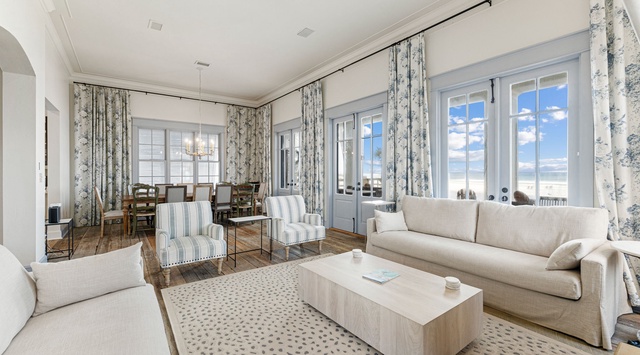 Coastal blues and French country accents abound inside this newly updated home. Natural light illuminates the chef’s kitchen, featuring double ovens, stone countertops, and a center island that seats 2. Double doors connect to the quaint courtyard with a 4-person table steps away for alfresco dining—a second courtyard with a 6-person table and grill is across the hall. Continue into the living and dining area, where a table for 12 waits. Winsome mix-and-match chairs paired with floral toile de Jouy curtains curate an atmosphere of laid-back elegance. Gather together for a serene evening watching TV on the matching couches and 2 armchairs in the living area. Outside, enjoy the balmy weather with a pitcher of lemonade at the 8-person and 4-person tables on the covered porch. Swim in the crystalline pool, relax in the Adirondack chairs, or walk to the beach! This floor has 1 charming guest bedroom with a queen bed and window seat, as well as an extra sleeping area with a twin-over-twin bunk bed, TV, and corner sofa.