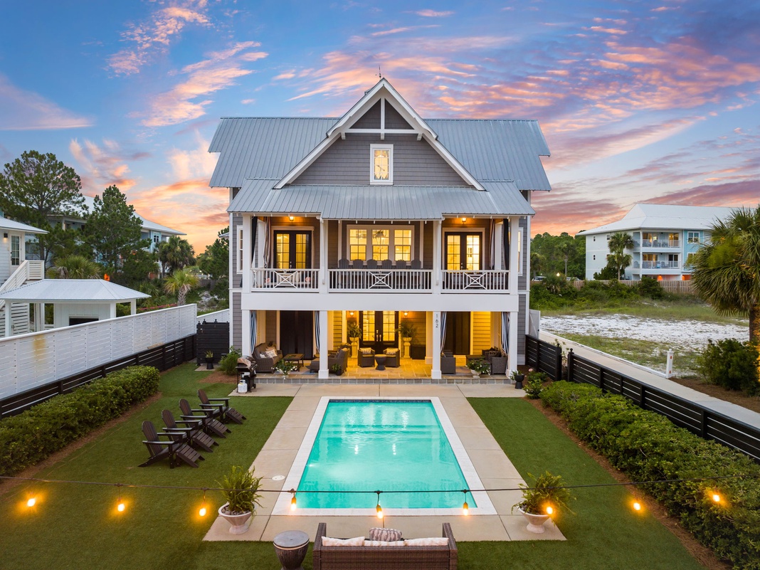 DETAILS: This 4 bedroom home is exactly what you and your family have been looking for! With a private pool and close beach access, you will feel relaxed at your own oasis. With a reverse open floor plan, enjoy a gorgeous gourmet kitchen, breakfast nook, and living room, all with beautiful Seagrove views. Just off this area, the porch features a great outdoor dining and living area. This level also includes a primary bedroom with a connected porch and ensuite bath.