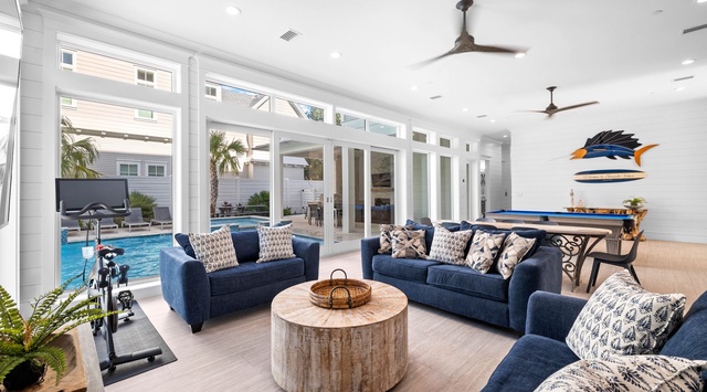 Shiplap walls and deep blue hues adorn the elegant second-floor great room. The gourmet kitchen is a chef’s paradise with Wolf and Sub-Zero appliances, dual dishwashers, a beverage refrigerator, 3 ovens, and an expansive island. There’s plenty of space for the whole group to savor decadent meals, with seating for 32 between the 2 tables and breakfast bar. After indulging, adjourn to the cozy living space’s plush blue couches, framing a 75” Smart TV. This level features 2 beautiful guest bedrooms, each with a king bed.
