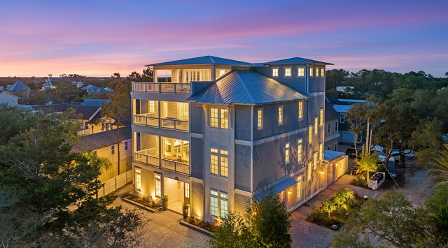 DETAILS: Escape to Seaside Views, a stunning Seagrove Beach home, comfortably accommodating 28 guests with 9 luxurious bedrooms, 10 full bathrooms, and 2 half baths. Tucked beside beautiful Seaside and a 3-minute walk from beach access, this 4-story home is perfectly positioned for an unforgettable coastal escape. Picture peaceful days of swimming in the saltwater pool, friendly competition in the game room, and savoring the Gulf sunset from the fourth-floor balcony.