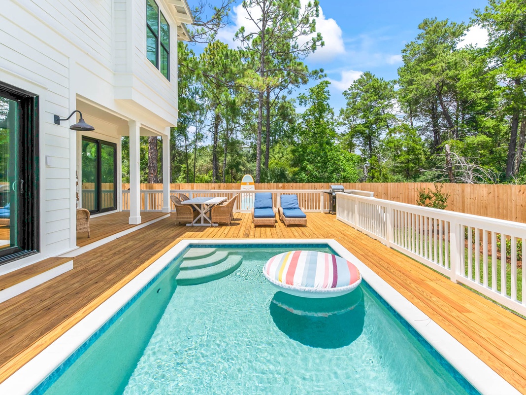 Thoughtful design touches help make Seasons in the Sun truly special. Guests will love the comfortable open living, dining, and kitchen space on the first floor that overlooks a backyard deck and pool. Hardwood floors, white shiplap walls, luxurious finishes, and accessories inspired by the beach create a space guests will enjoy. Premium appliances, marble countertops, and an island that seats 4 create a kitchen with plenty of space to prepare meals. A butler’s pantry hides a stackable washer/dryer and provides additional counter space. A dining table seats 6 and divides the kitchen from the living area. 2 linen sofas and an oversized armchair with a footrest surround a 75” Smart TV, and enjoy views of the deck through sliding glass doors that open to the pool area. A mudroom off the living area provides access to the backyard and has hooks for towels, shelves for beach bags and toys, quick access to a bathroom with a shower, and a beverage fridge. In the heat of the summer, guests will appreciate the wood decking that surrounds the pool. An outdoor dining table, cushioned chaise lounge chairs, and a gas grill surround the pool. An outdoor shower makes it simple to rinse off beach sand before jumping in the sand.