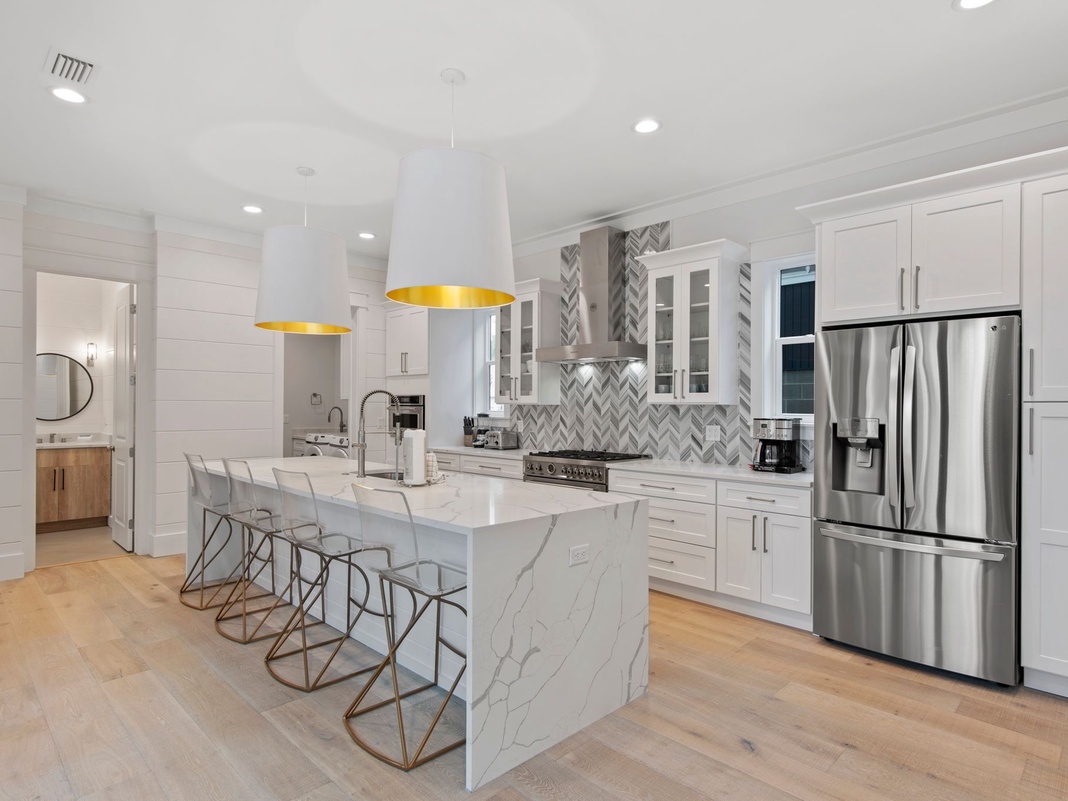 DETAILS: It will be hard to say goodbye to Shore Beats Work. This brand new 5-bedroom, 4-bathroom Seagrove Beach home sleeps 16 in sumptuous comfort. Guests will enjoy a short walk to the beach, a private heated pool with a wide sun shelf and sitting spa, 6-passenger Low-Speed Vehicle, multiple porches, and spaces designed for long conversations.
