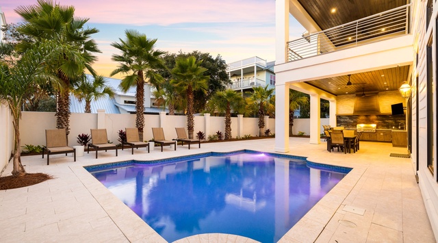 DETAILS: This expansive and immaculate Seagrove Beach home offers accommodations for 26 guests, a heated pool, outdoor kitchen, an observation deck, and is only steps from the beach!