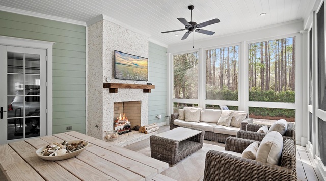 Designed by the renowned architects of Caldwell-Cline, this lovely home welcomes guests with a wide porch bedecked with padded wicker furniture and an overhead fan. Inside, reclaimed heart pine floors, shiplap walls, and cypress-beamed ceilings add understated elegance to the comfortable living space, furnished with 2 plush white couches, matching armchairs, a 65” Smart TV, and Sonos soundbar. The airy kitchen seamlessly connects to the living area and features custom cabinetry and Thermador appliances. Continue into the dining alcove with a pale wood round table that seats 6. This level has 1 guest bedroom with a king bed and private bathroom. A screened porch with woven furniture and a picnic table begs guests to unwind with a tart glass of lemonade on a breezy afternoon. The yard backs up to a stunning nature preserve, providing a secluded oasis to enjoy the covered veranda, crystalline pool, and sitting spa.