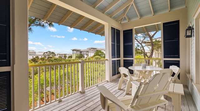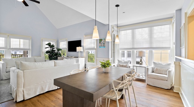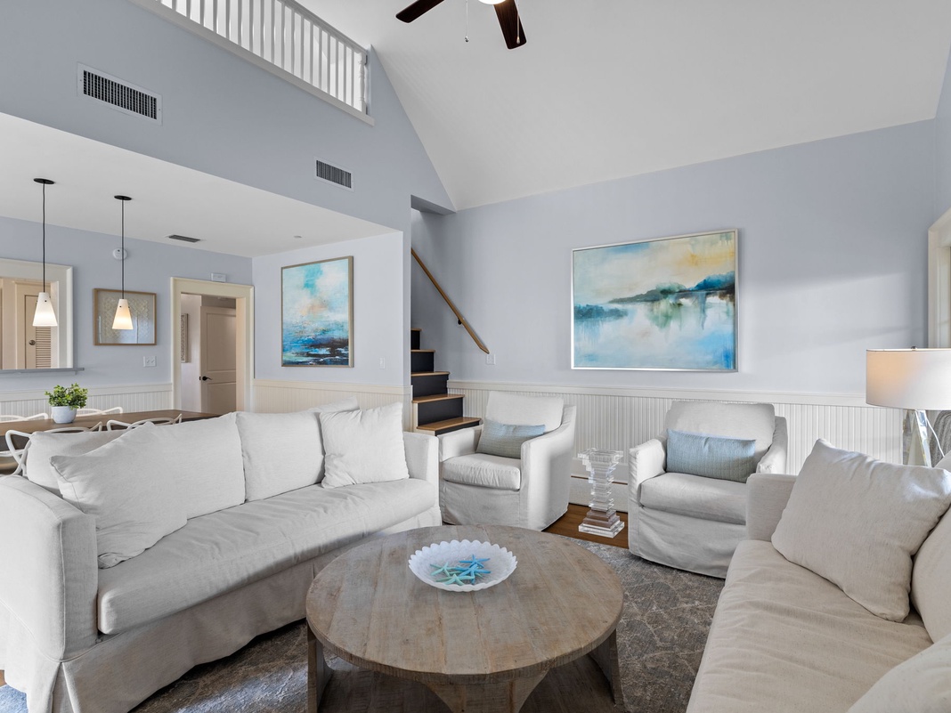 DETAILS: Enjoy Gulf views from the "Point of Vue" patio while breathing in the fresh salt air from your vantage point in WaterColor's popular Park District. This adorable 1-bedroom with loft, 2 bathroom unit sleeps 4 and is close to the beach, the newly expanded WaterColor Beach Club, and Seaside. "Point of Vue" has newly remodeled bathrooms, new flooring, and a cottage coastal decor. The primary bedroom with a Smart TV, king bed and newly renovated private bathroom with walk in shower is tucked beside the kitchen - perfect for late-night snacks. The dining table flows into the living room boasting comfortable sofas, and oversized chairs surrounding a large Smart TV. This comfortable space provides family an area to share stories from the beach. Up a wooden staircase, perched high above the living room, is a cozy loft space with a full bed and sitting chair.